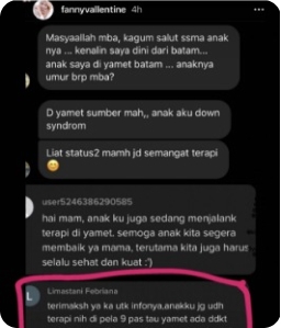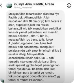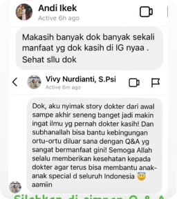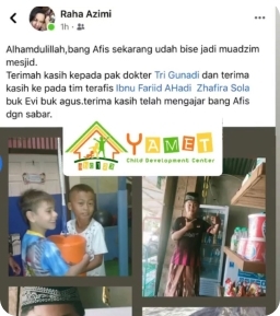Assalamualaikum wr. wb. Perkenalkan saya Mama Riana, Ini saya mau kasih semangat ke ibu. Alhamdulillah anak saya masuk di Yamet ini perkembangannya luar biasa, ini belum sampai 3 bulan, Anna anak saya kosakatanya banyak banget, terus bisa membuat kalimat, terus bisa bercerita. Anak saya ini ke kakaknya atau ke abangnya sangat sangat cerewet lah istilahnya, dia bisa mengatur bisa "ini kalian harus kayak gini", dia yang iniin sama kakaknya, kayak gitu. Terus gini, saya ke Bunda semuanya yang jelas kita harus semangatlah untuk para bunda dengan terapi dan pola asuh yang benar.