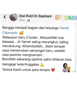 Anak saya dengan diagnosa Autis, semua orang tua termasuk saya, pasti sangat terpukul dengan diagnosa itu, dulu sampai ada dokter yang bilang sama saya, kalau Autis itu tidak akan bisa sembuh seumur hidup, itu kata dokter yang mendiagnosa anak saya dulu. Kebayangkan bagaimana hancurnya perasaan orang tua saat itu, tapi Alhamdulillah Allah nunjukkin saya bertemu dengan Yamet Cikampek. Alhamdulillah berjodoh dengan Yamet Cikampek, dengan terapi, bimbingan para terapis, bapak dokter juga, kerja sama kita, anak saya Alhamdulillah sekarang sudah bisa bicara yang dulunya punya dunia sendiri dan dianggap tidak akan bisa bicara. Alhamdulillah sekarang dia bawel, dia bisa marahin saya, dia udah bisa ngasih tau saya "bu begini lho bu, sekarang begini lho bu" itu berkat kegigihan para terapis dan yamet juga. Saya banyak-banyak terima kasih dan Alhamdulillah Allah pertemukan saya dengan Yamet, sehingga saat ini saya bisa menepis bahwa tidak ada yang tidak mungkin kalau kita ada kemauan dan ada Ridha dari Allah swt. Terima kasih Yamet Cikampek. Jadi, untuk mama - mama yang mempunyai anak istimewa diluar sana, tetap semangat, dukung anaknya, kita berjuang bersama dengan terapisnya, dengan dokternya dan juga kita selaku orang tua, karena tidak ada yang tidak mungkin di dunia ini, anak berkebutuhan khususpun bisa menjadi anak tipikal.